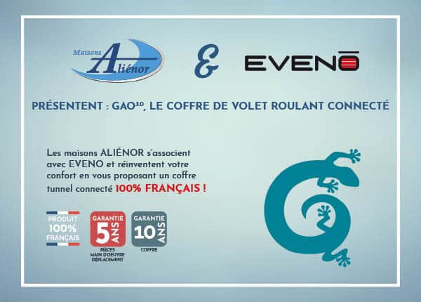 Le coffre Tunnel Connecté : GAO 3.0 Les maisons Aliénor s’associent avec Eveno fermetures pour vous proposer un Coffre Tunnel Connecté : le GAO 3.0. Ce produit 100% Français est désormais disponible sur nos chantiers de maison. Le Gao 3.0, coffre connecté à la fois aux corps de métiers et aux consommateurs Le coffre est connecté à tous […]