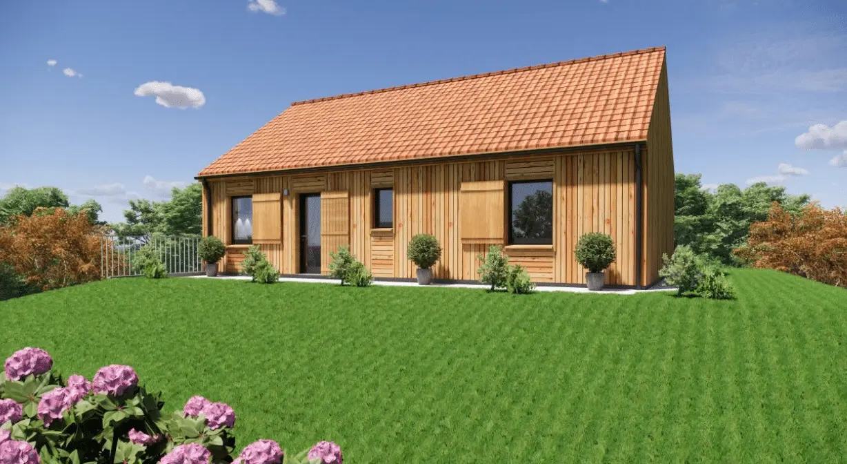 Spécialiste de la construction de maisons bois en Dordogne, Corrèze & Charente, Maisons Aliénor « Bois » vous présente son modèle de maison bois de plain pied de forme rectangulaire Fauvette.