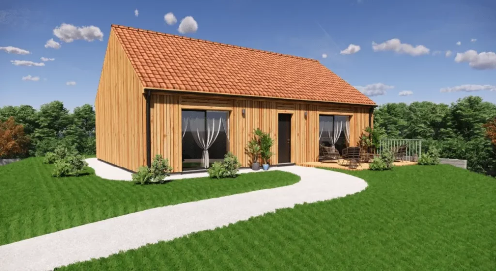 Le modèle de maison bois FAUVETTE, c’est le choix d’un habitat conçu en harmonie avec son environnement, grâce à l’utilisation du bois, un matériau durable et écologique. Ce choix assure non seulement une excellente isolation thermique et phonique mais participe également à la réduction de l’empreinte carbone de la construction.