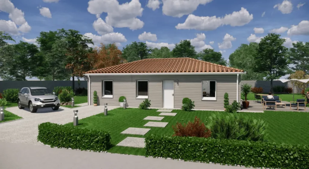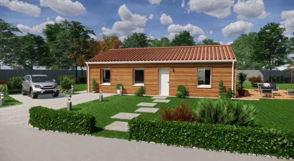 Spécialiste de la construction de maisons bois en Dordogne, Corrèze & Charente, Maisons Aliénor « Bois » vous présente son modèle de maison bois de plain pied de forme rectangulaire Mésange.