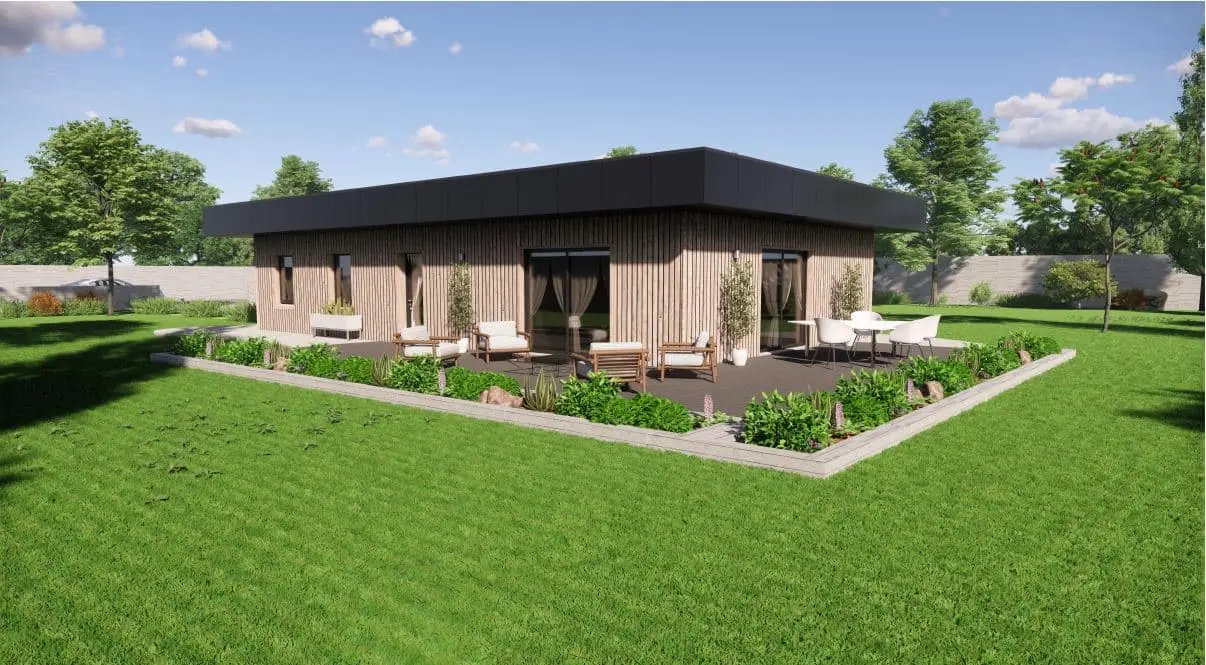 Spécialiste de la construction de maisons bois en Dordogne, Corrèze & Charente, Maisons Aliénor « Bois » vous présente son modèle de maison bois de plain pied de forme rectangulaire BALBUZARD.