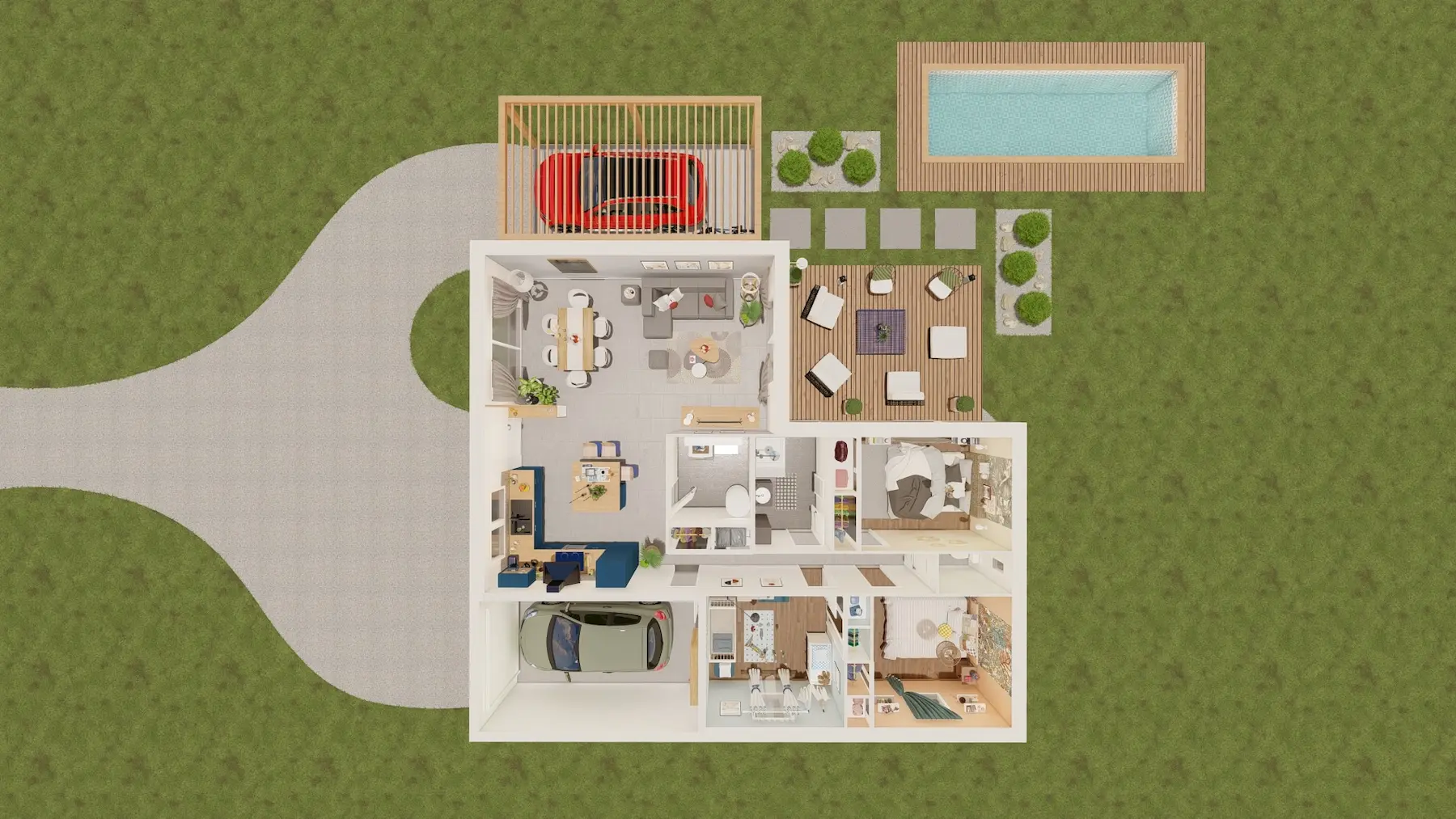 Cette maison moderne généreuse, contemporaine et lumineuse, largement ouverte sur l’extérieur se compose de deux espaces bien séparés permettant de distinguer les pièces de jour et celles de nuit.