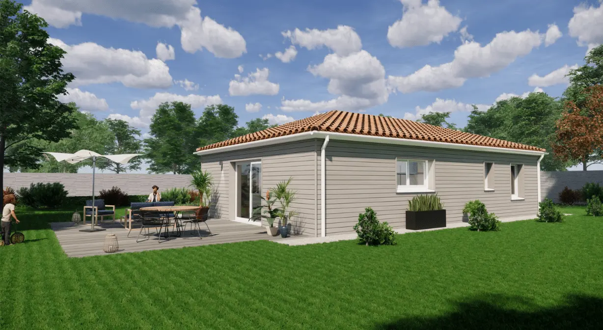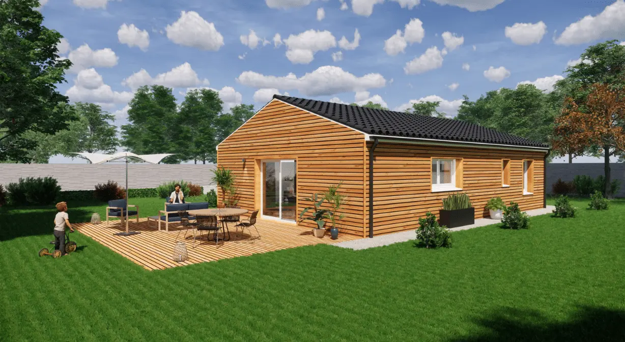 Spécialiste de la construction de maisons bois en Dordogne, Corrèze & Charente, Maisons Aliénor « Bois » vous présente son modèle de maison bois de plain pied de forme rectangulaire Mésange.