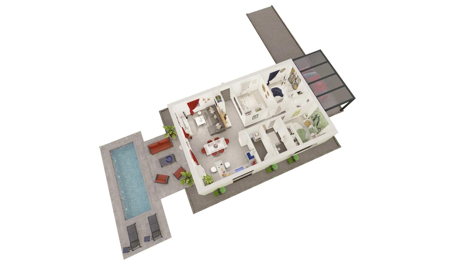 Cette maison moderne généreuse, contemporaine et lumineuse, largement ouverte sur l’extérieur se compose de deux espaces bien séparés permettant de distinguer les pièces de jour et celles de nuit.