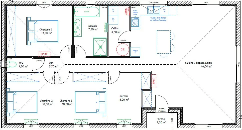 Ce modèle de maison est à titre d’exemple afin de vous donner des idées et de vous montrer le travail effectué. Toutefois, nous mettons un point d’honneur à créer pour vous le plan de la maison qui VOUS convient, qui VOUS ressemble, dans le budget que vous nous annoncez aussi bien dans le traditionnel que dans le contemporain !