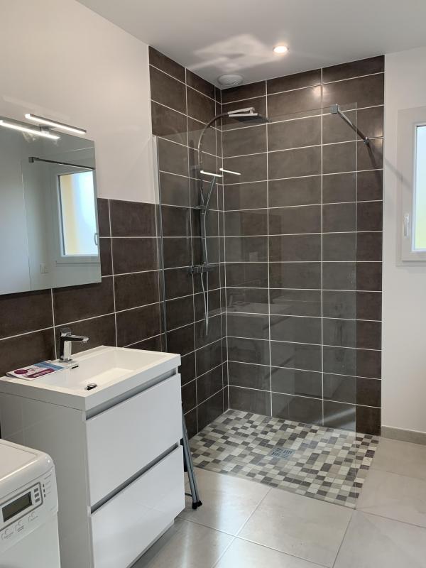 La maison est de plain pied, avec de grands volumes, plusieurs chambres dont une suite parentale avec dressing. L’espace de vie est lumineux, les grandes baies vitrées laissent une lumière naturelle traverser la pièce. La cuisine est fonctionnelle et donne sur ce grand espace lumineux.